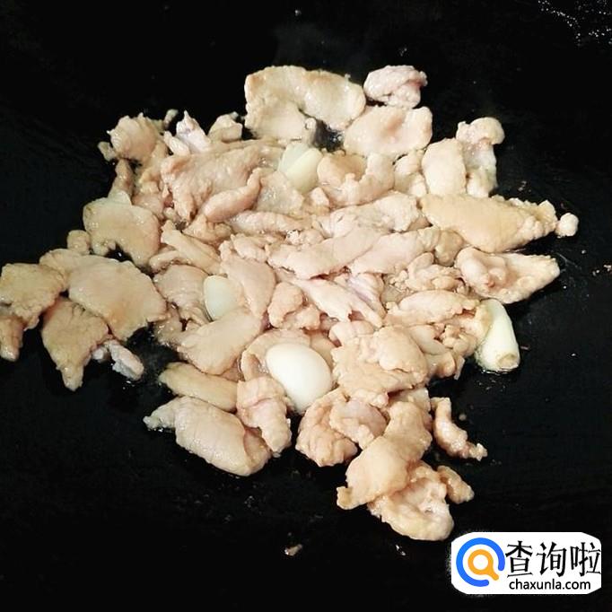 锅烧七成热,放适量花生油,油热后先放蒜片小火煸出香味,再把猪肉放下去转大火爆炒至肉变成白色为止。