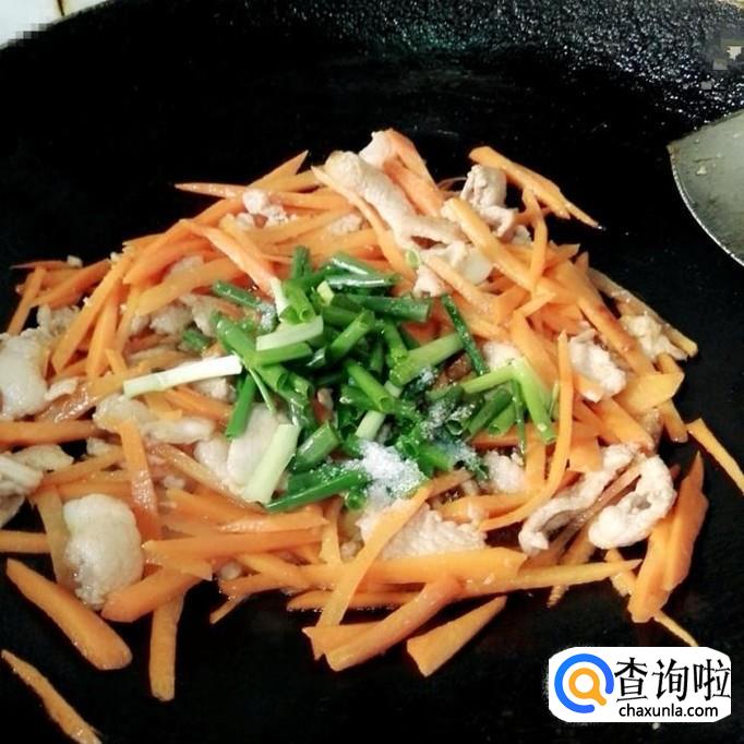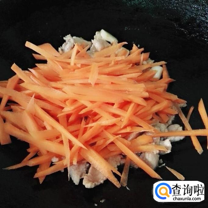 接着把胡萝卜丝放下来,还是开大火炒半分钟,因为胡萝卜不需要炒太熟。稍稍炒断生就好。