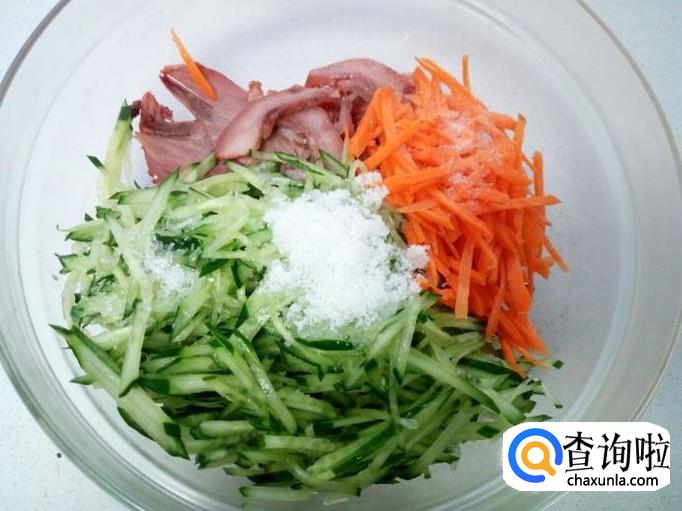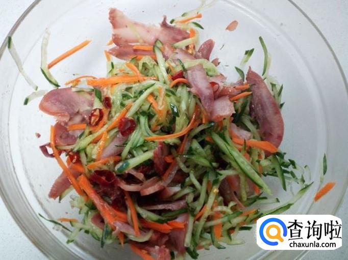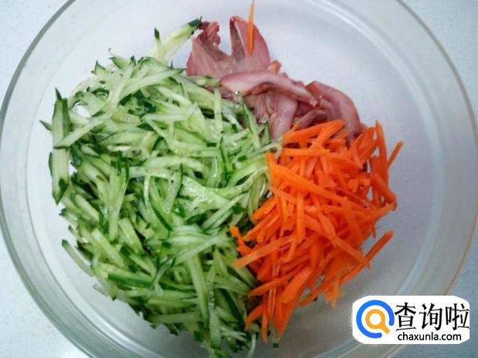 把切好的黄瓜丝,猪头肉,胡萝卜丝,放入碗中。放入白糖,醋,盐,味精,拌和均匀。