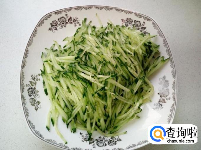 黄瓜用水清洗干净,控干水分,切成丝,备用。