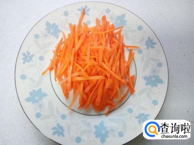 香菜收拾清洗干净,控干水分,切成段。胡萝卜去皮,用水清洗干净,切成丝。