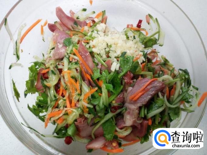 放入香菜,蒜末,拌和均匀。最后滴上芥末油拌和均匀即可。