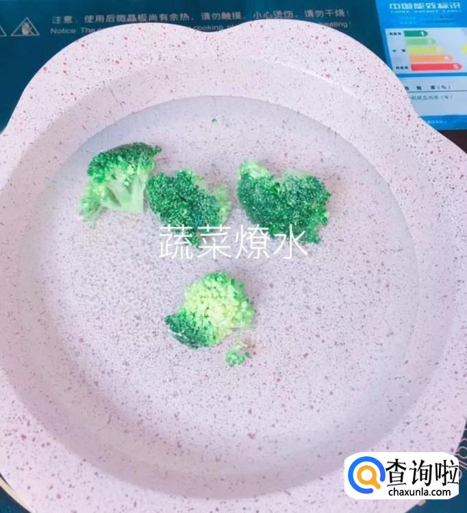 首先锅中放入适量的清水,待水烧开,倒入西兰花煮三分钟,捞出控水,如下图所示。小贴士:大家在煮西蓝花的时候可以加入适量的宝宝食用盐和宝宝油,加盐可以让西蓝花更好的入味;加油,可以让西兰花煮出来颜色更加漂亮。
