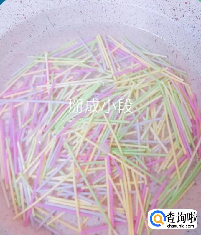 接着锅中放入适量的清水,待水烧开,把五彩细面放进去,开大火煮五分钟,如下图所示。小贴士:大家最好把五彩细面掰成小段,再放到锅中煮会比较好。
