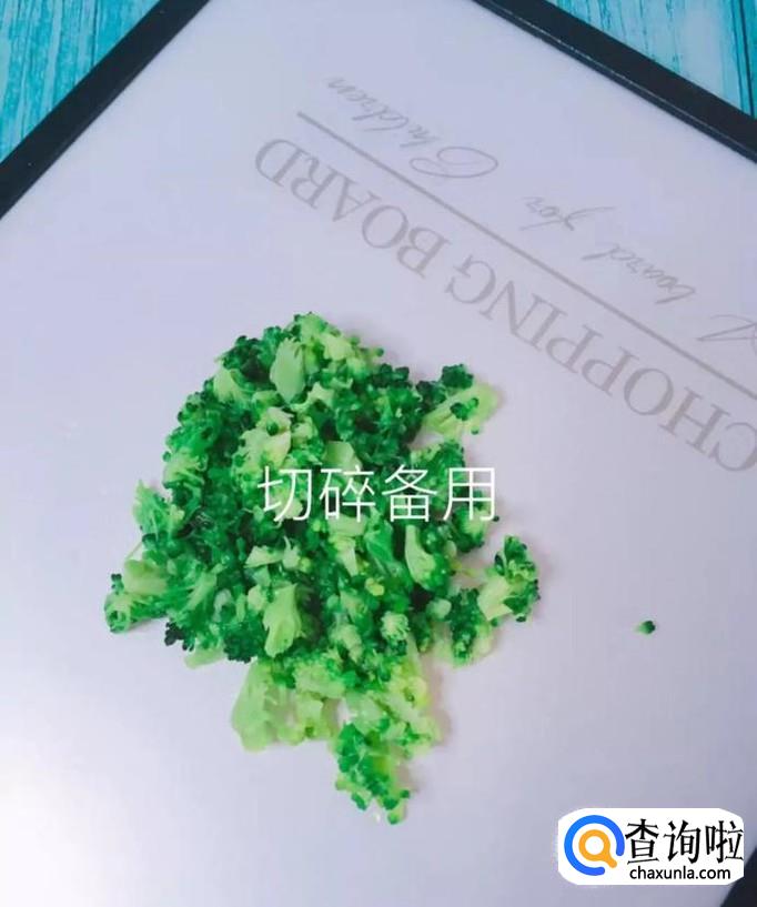然后把煮好的西兰花用刀剁碎,如下图所示。小贴士:西蓝花剁的越碎越好,这样方便宝宝食用。