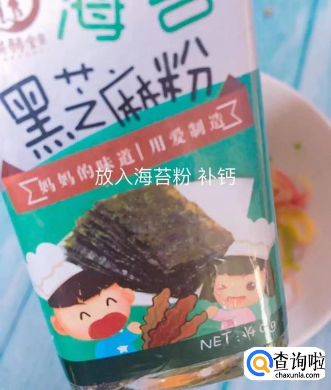 接着在装着面条的碗中,加入适量的海苔粉,如下图所示。小贴士:宝宝经常食用海苔粉能够达到补钙的效果。