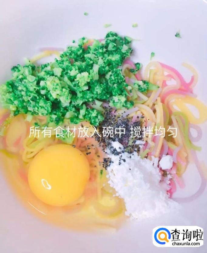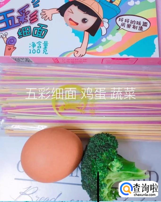 食材:五彩细面,鸡蛋,西兰花,海苔粉。