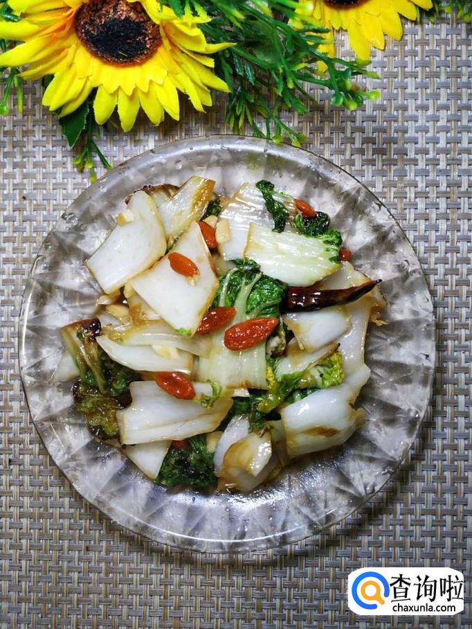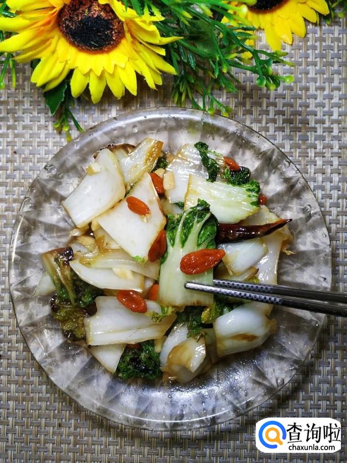 黄心乌塌菜适量,枸杞子适量,盐适量,鸡精适量,生抽适量,陈醋适量,干辣椒适量。