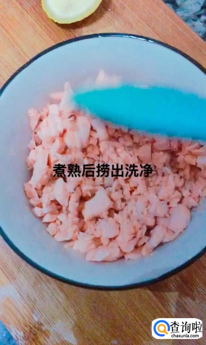 然后将煮熟的三文鱼片捞出清洗干净,如下图所示。