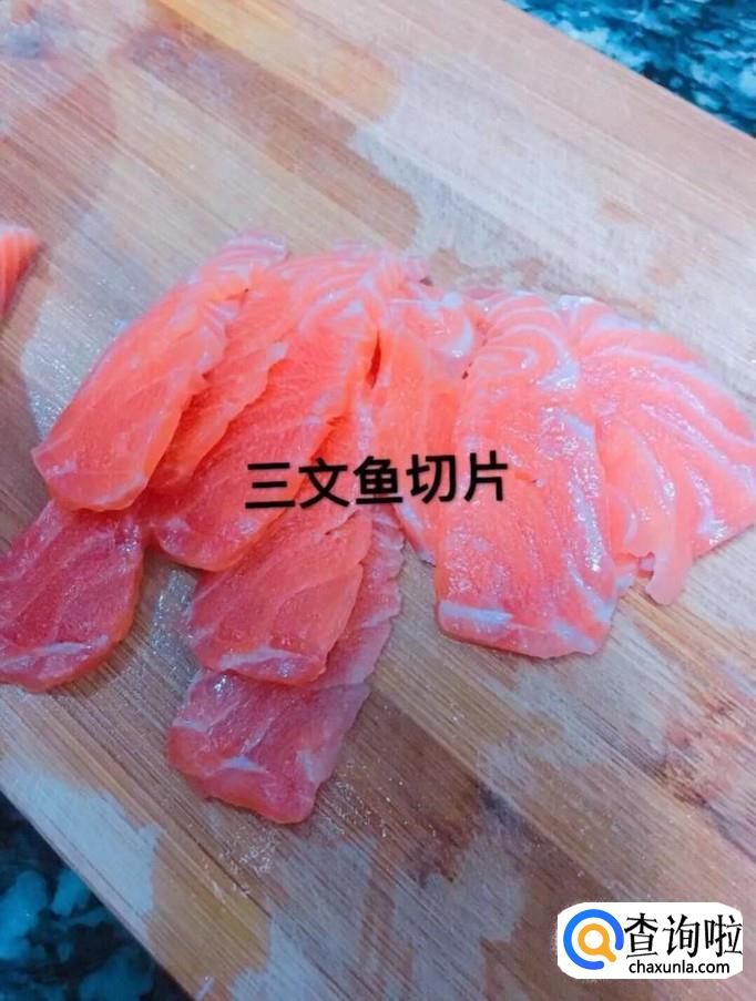 然后将三文鱼切成片,如下图所示。