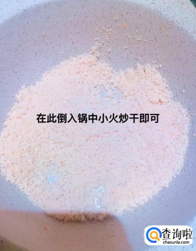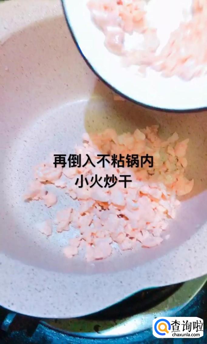 接着把打碎的三文鱼继续倒入锅中,开小火炒干就可以了。