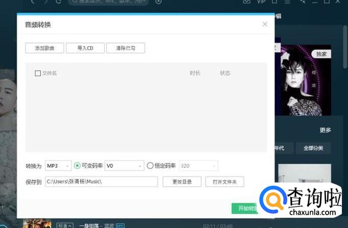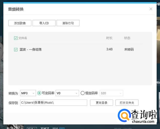 点击【添加歌曲】,选择要转码的音乐,选择MP3格式,选择保存地址,点击确认即可,如图所示。