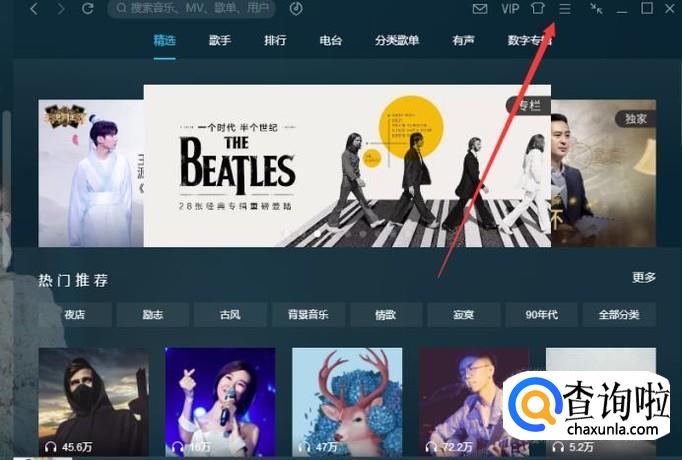 打开【qq音乐】,单击主页面右上方的【主菜单】按钮。