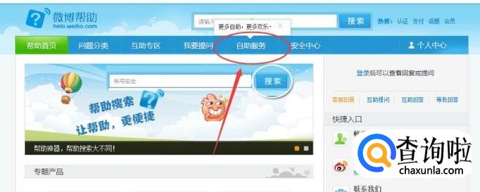 在【微博帮助】页面中点击上方的【自助服务】,如下图所示: