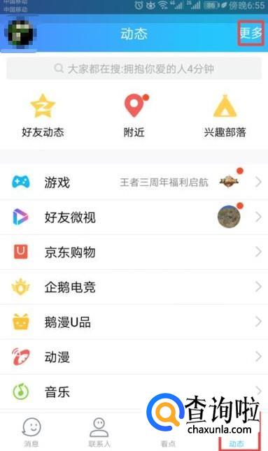 首先,我们打开我们的QQ,然后我们点击动态,之后我们点击右上角的更多;