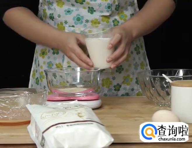 首先将热的纯牛奶加入装有7克酵母的碗中。
