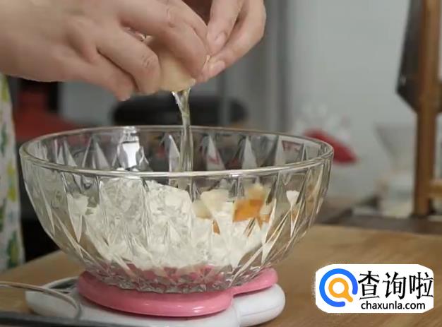将高筋面粉、白砂糖、鸡蛋倒入牛奶中,用筷子搅成絮状。
