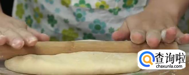 将发酵好的面团用擀面杖排气,擀成1厘米厚的面皮。