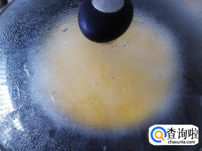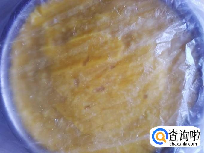 然后把搅拌好的糯米糊倒进去,用保鲜膜盖上。