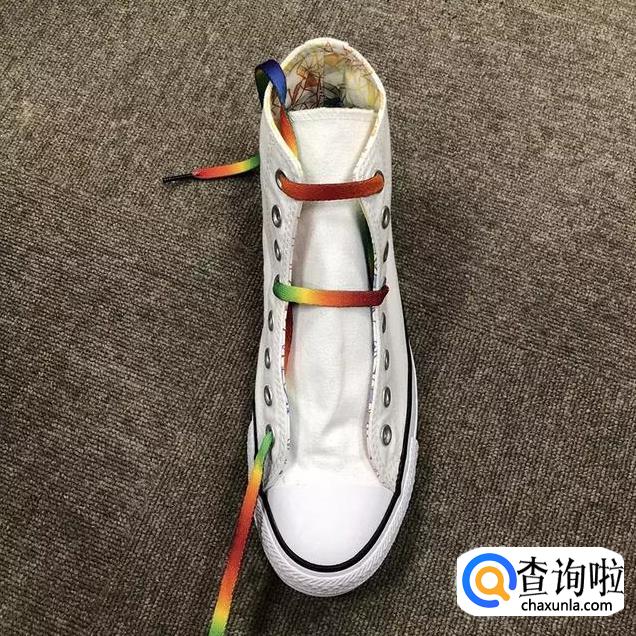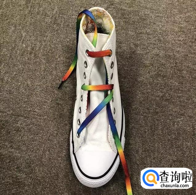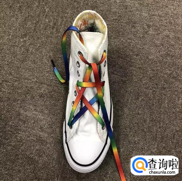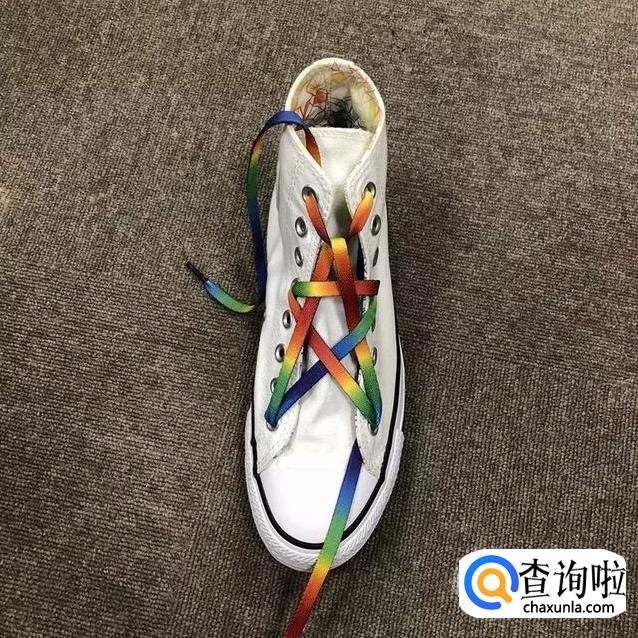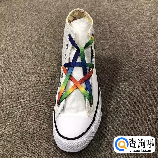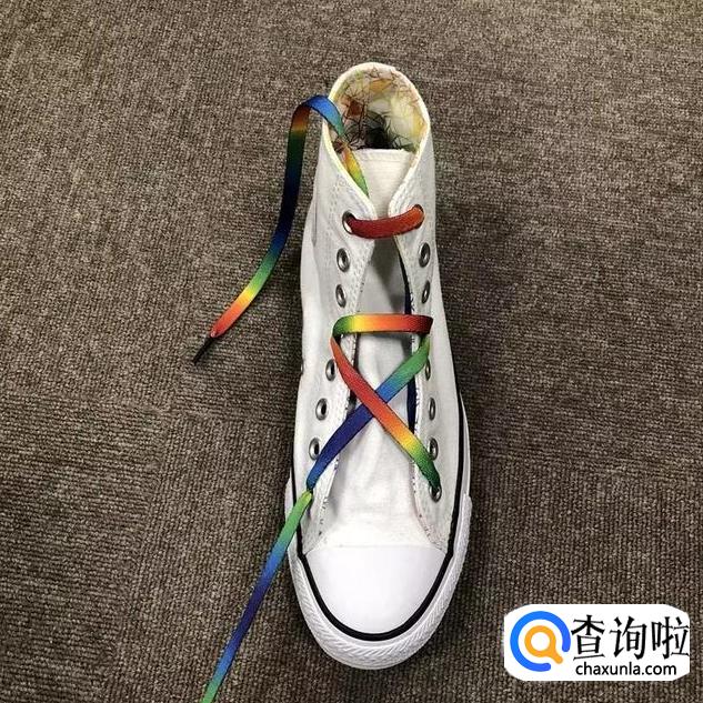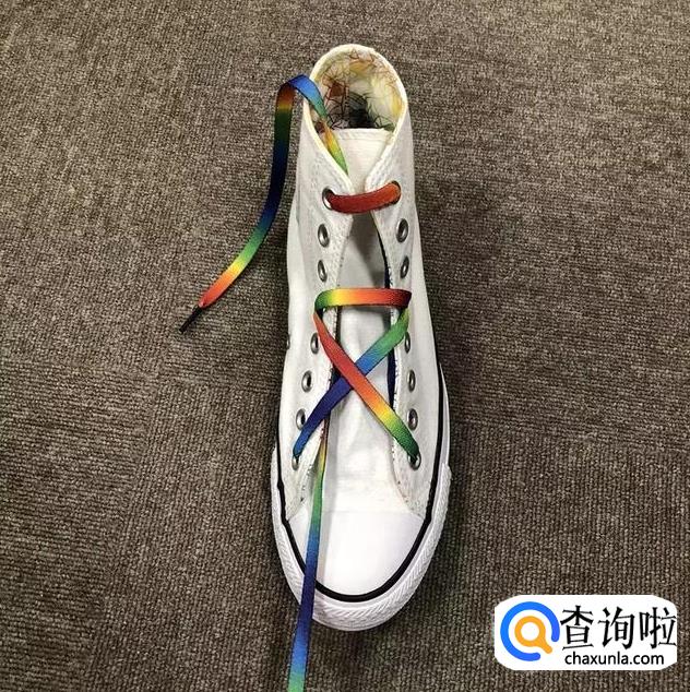 鞋带从中间穿过后在最上面的横杠鞋带上绕一下;
