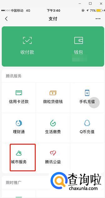 进入支付页面,在页面中找到【城市服务】,然后点击。
