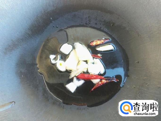 锅里倒入一点花生油或者玉米胚芽油,烧至五六成热放入葱姜蒜红辣椒丝炒,小火让其炒出香味。