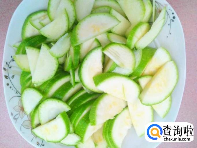因为角瓜特别的嫩,所以根本不用去皮去瓤,直接切开两半,然后切成片装进盘子里就可以啦。