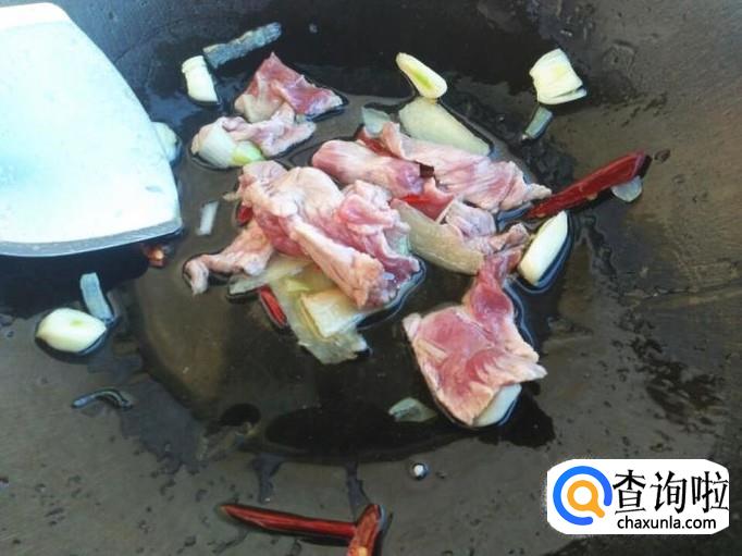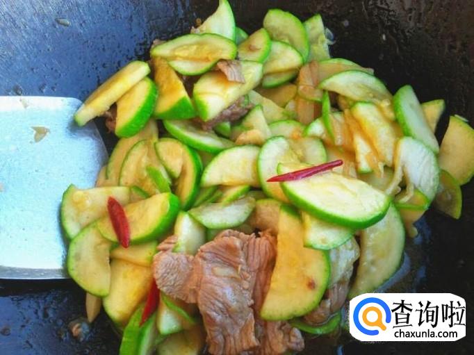 肉片切的特别薄,所以很快就炒熟了,将角瓜片倒进去。