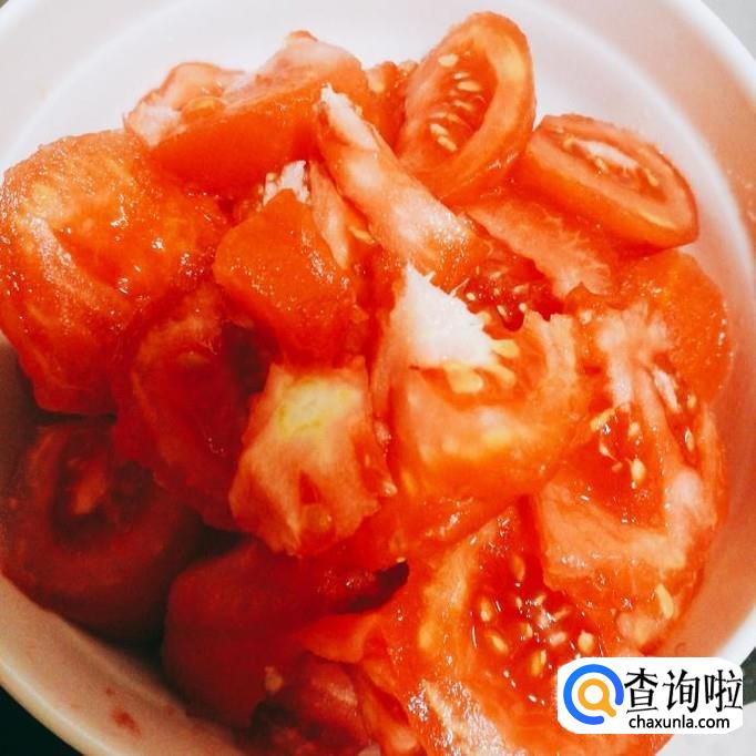 将买来的番茄在温水中浸泡去皮之后,切成块状。
