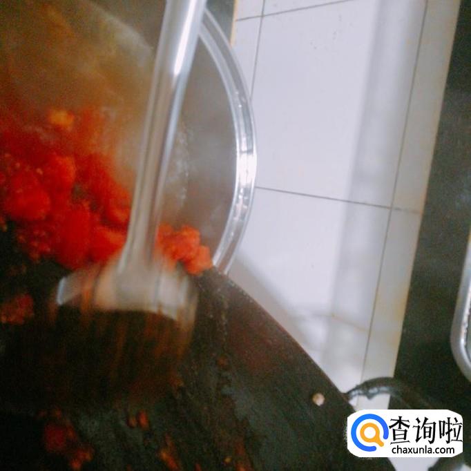 不停用铲子翻炒番茄,直至番茄出汁变软。