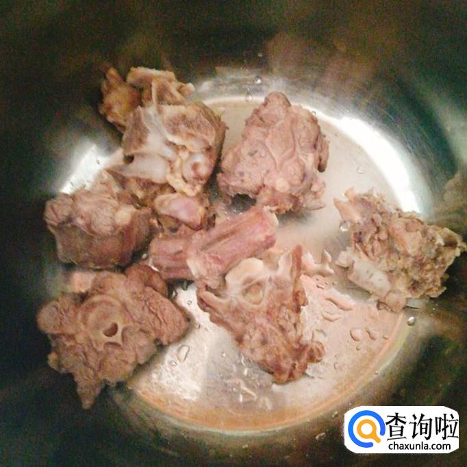 将从超市买回来的新鲜牛尾切成块状,放在装有清水的锅中淖水。