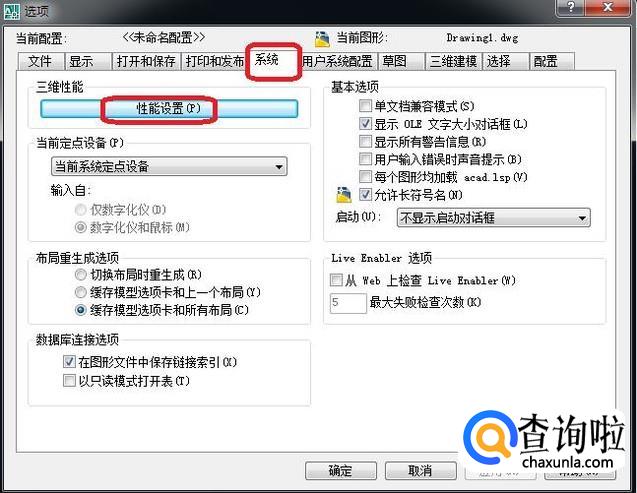 在选项面板中点击“系统”标签,然后如图所示,点击“性能设置”按钮。