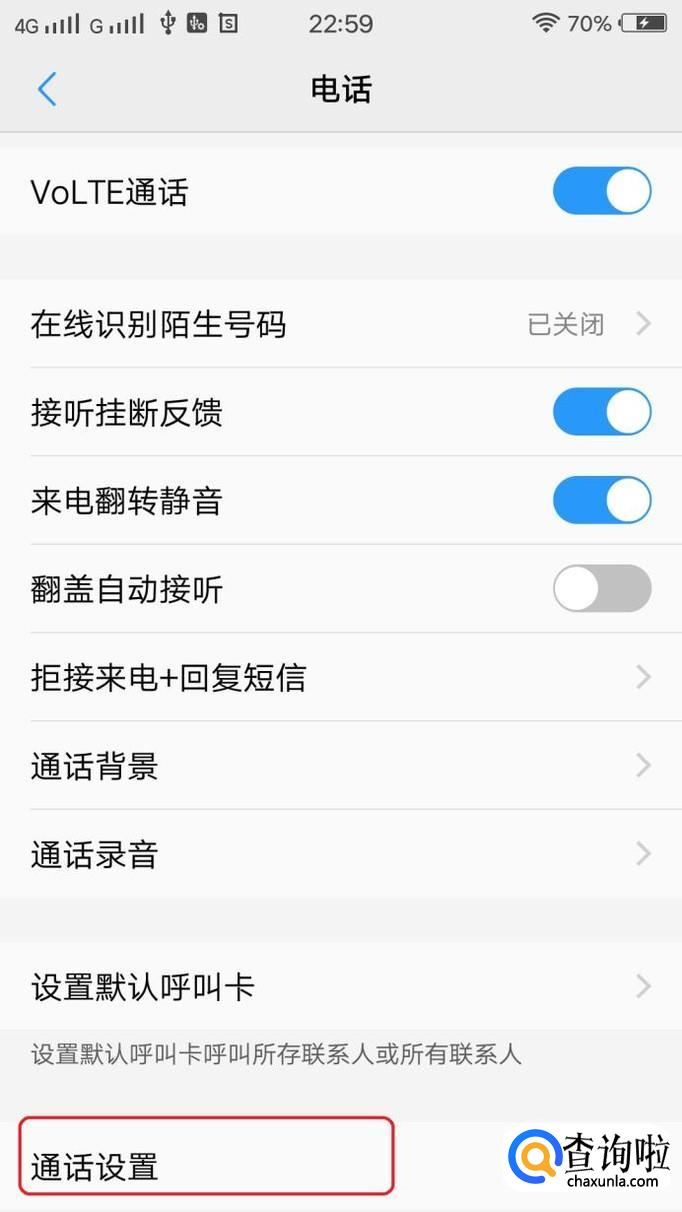 然后在下一页面往下划动屏幕,直到找到“通话设置”,点击一下。