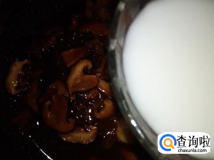 翻炒入味,然后倒海鲜菇里的汤汁进去。