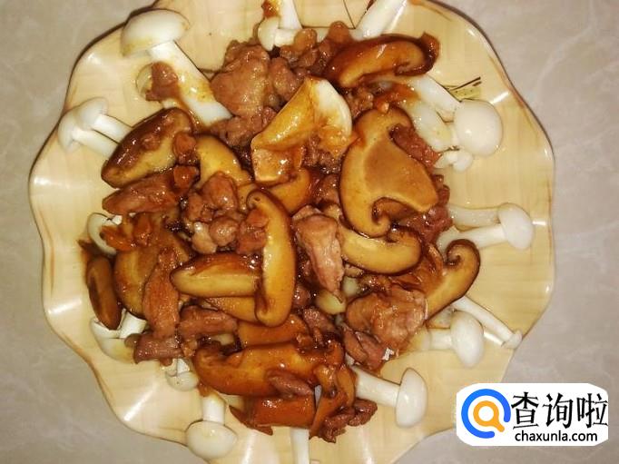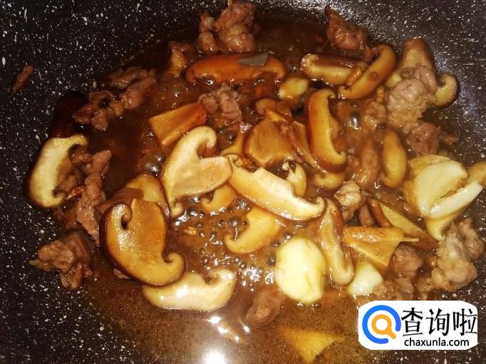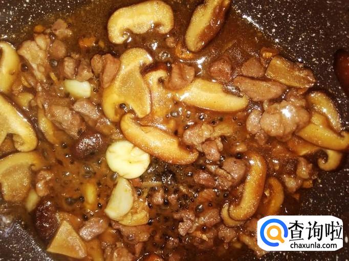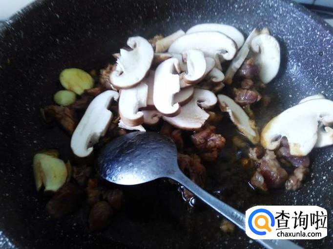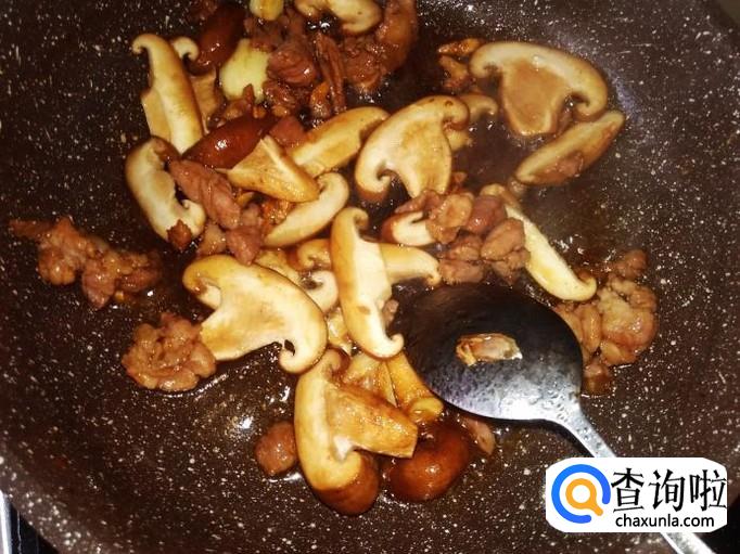 放香菇进去翻炒。【不用放盐了,因为肉丁已经放足料了】