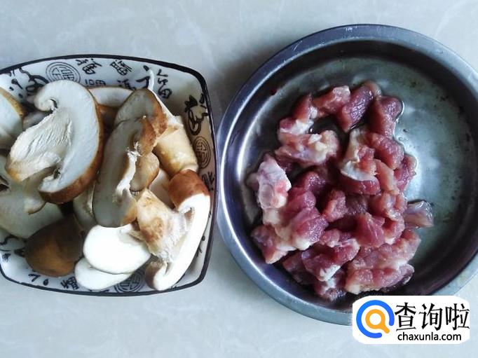 瘦肉清洗干净切成小丁,香菇去根头,然后清洗干净切成片。
