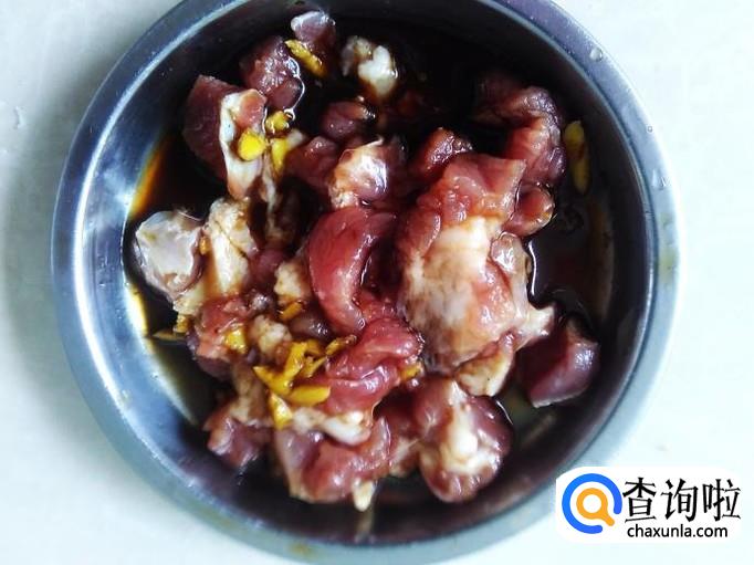 肉丁里加适量的盐、生抽、料酒腌制几分钟。