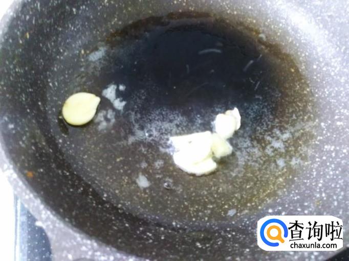 再用另一个锅,开火下油,放蒜米进去爆出味来 ,然后放肉丁进去翻炒至变色。