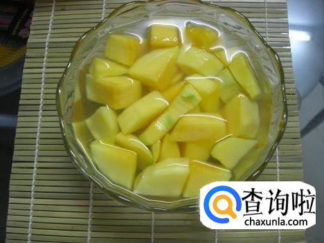 腌制完成以后把芒果放进冷水中,最好是冷开水,然后装进碗里冷藏,随时都可以吃!