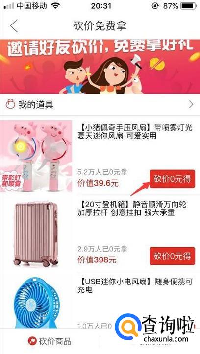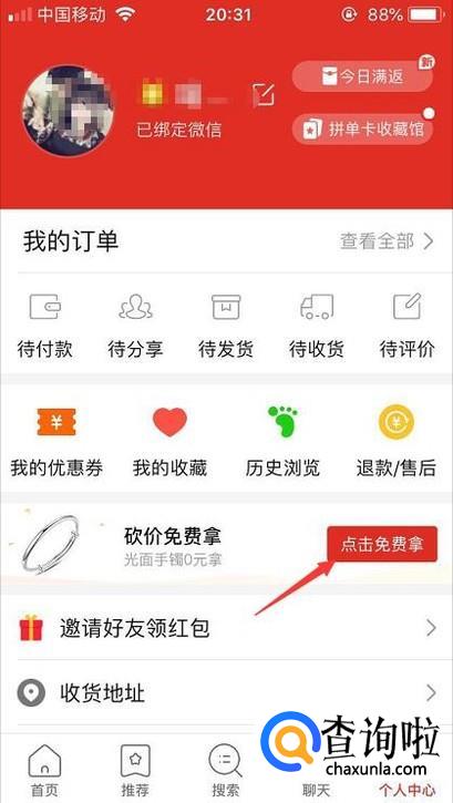 在个人中心页面上会有一个砍价免费拿的入口,点击进去。