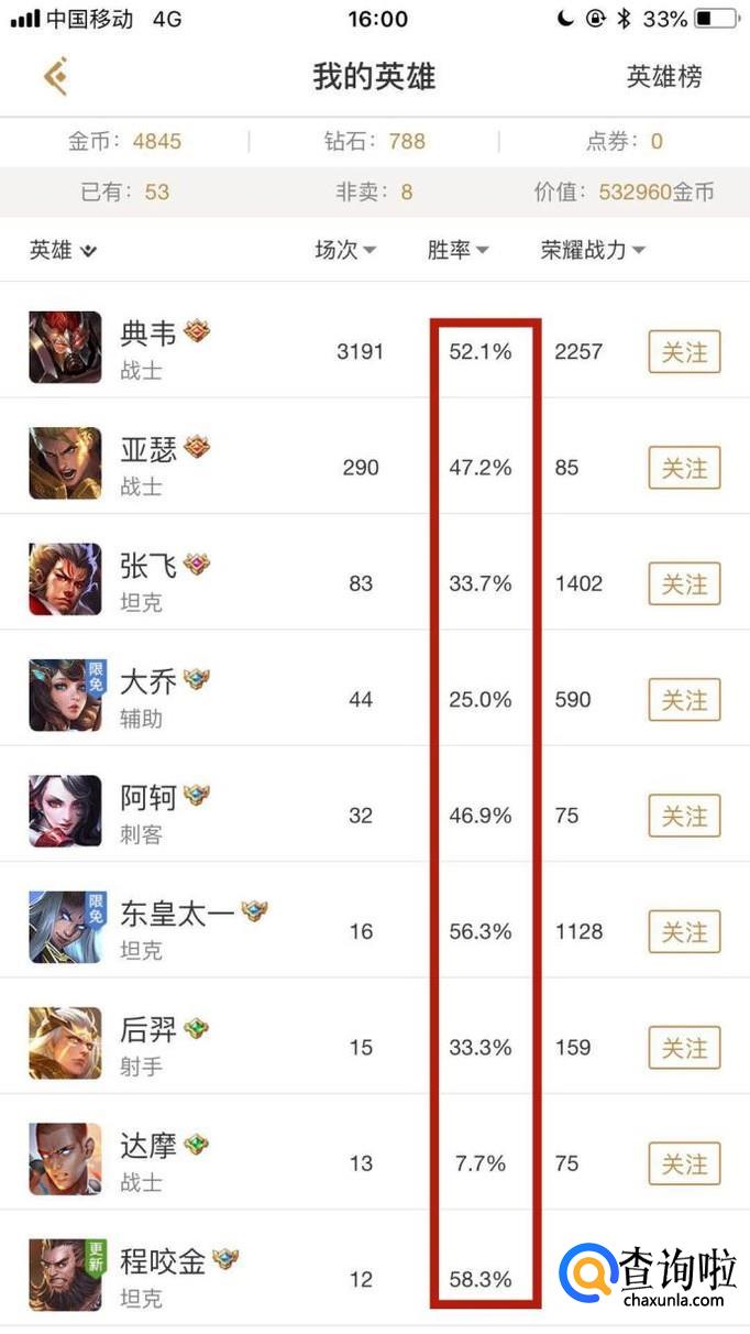 在这里我们就可以查询到我们自己所拥有的所有英雄的胜率了。