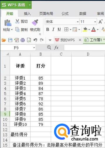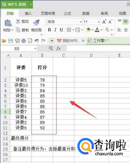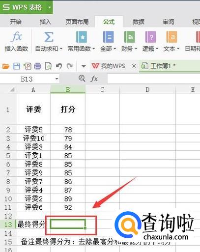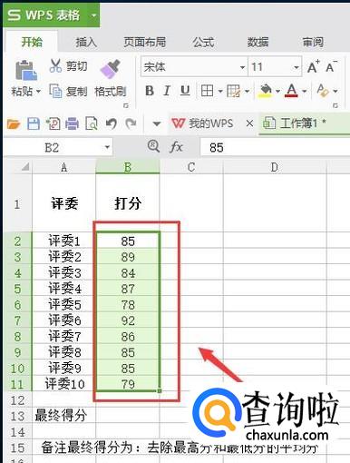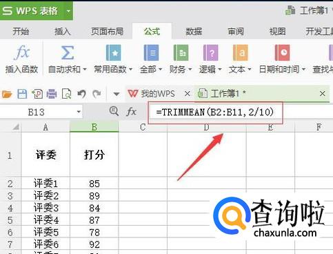 如图位置输入=TRIMMEAN(B2:B11,2/10)【格式如下:=TRIMMEAN(选定区域,m/n)m表示需要截去的数量,n表示总个数。】