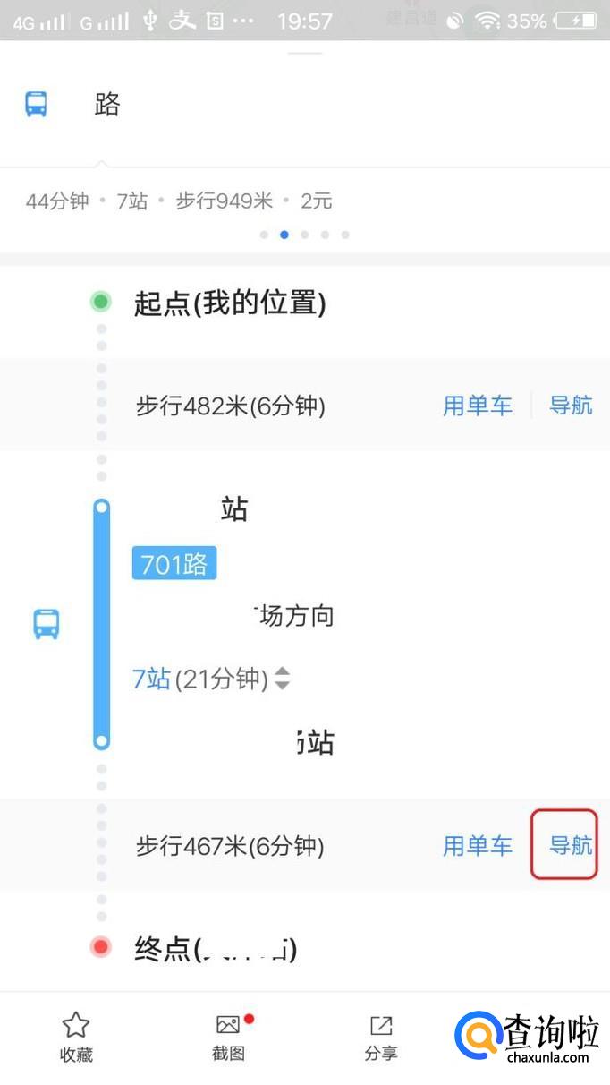 我们点击进入其中一种倒公交方式,里面会详细给出坐公交方法,我们要是不清楚周边情况,还可以点击“导航”调出地图来寻找路线。