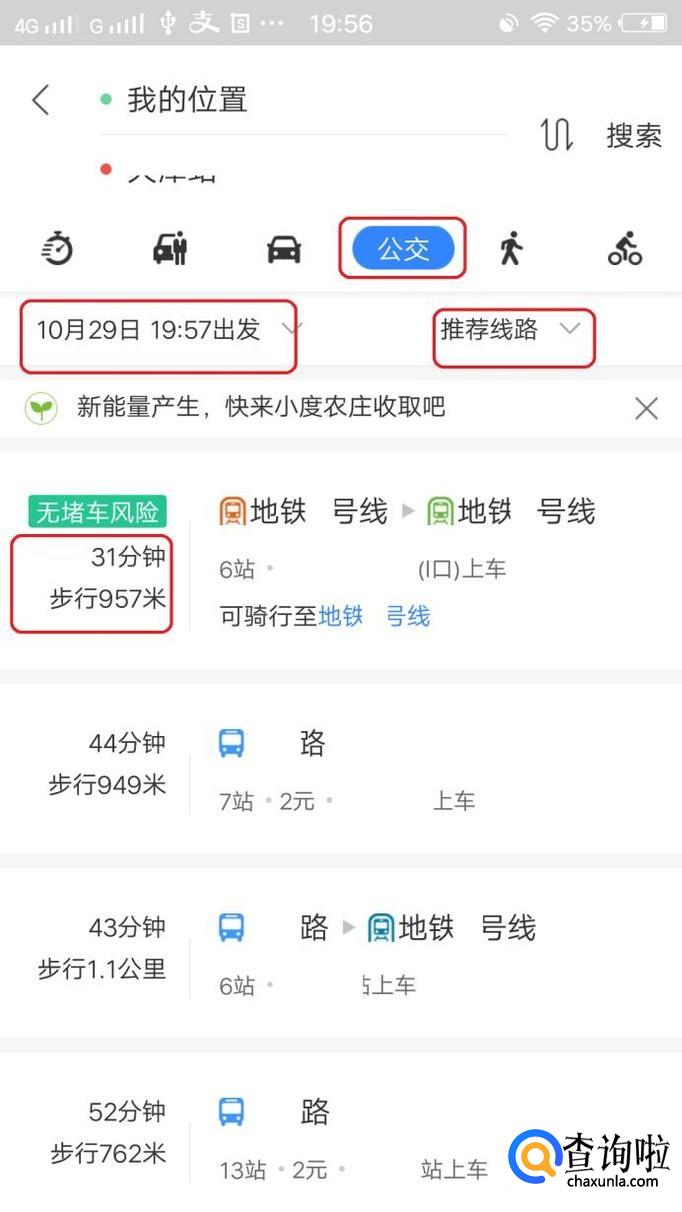 此时,地图就会给出坐车方式了,如图所示,地图会实时计算,大概多长时间,经过多少站,步行多少米能到达目的地,我们也可以点击“推荐路线”,选择最快、最少步行等多种方式。