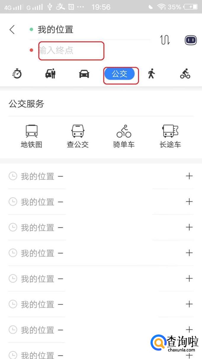 已知我的当前位置,我们需要输入终点,然后,点击图中的“公交”图标,选择公交出行方式。