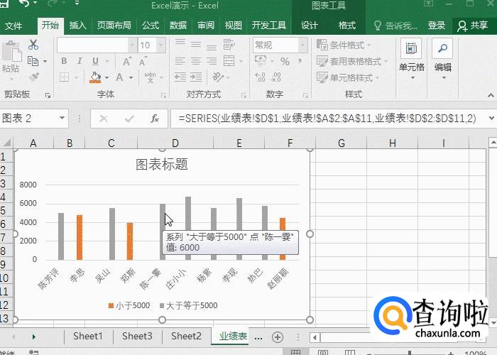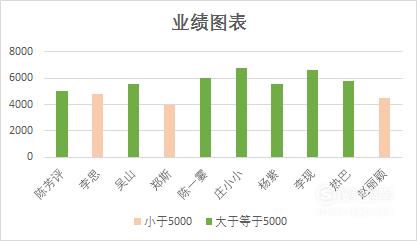 绿色的柱形图表示业绩大于等于5000,小于5000的是浅橙色柱形图。