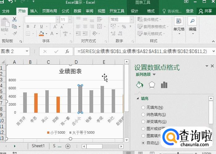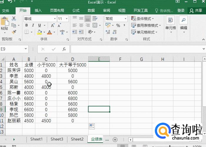 先在业绩后面增加两列辅助列,其一设置数据参数小于5000,=IF(B2<5000,B2,0)。其二设置数据参数大于等于5000的,=IF(B2>=5000,B2,0)。