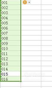 点击完确定后,回到表格中,在第一个单元格中输入001,然后下拉,出现002,003等,我们可以看到在单元格的左上角有个绿色标志,这就说明单元格已经设置为文本格式了,可以正常输入001,002
