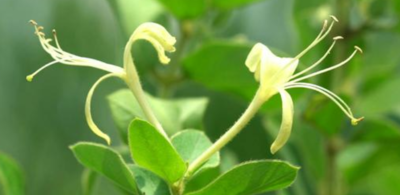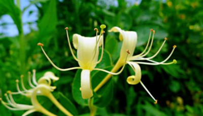 金银花属多年生半常绿缠绕及匍匐茎的灌木。小枝细长,中空,藤为褐色至赤褐色。卵形叶子对生,枝叶均密生柔毛和腺毛。夏季开花,苞片叶状,唇形花有淡香,外面有柔毛和腺毛,雄蕊和花柱均伸出花冠,花成对生于叶腋,花色初为白色,渐变为黄色,黄白相映,球形浆果,熟时黑色。