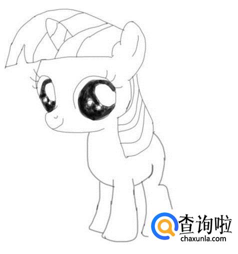 再在头部和鬃毛的基础上画出小马宝莉的身体,然后在身体下面画出小马宝莉的腿部,如图所示:
